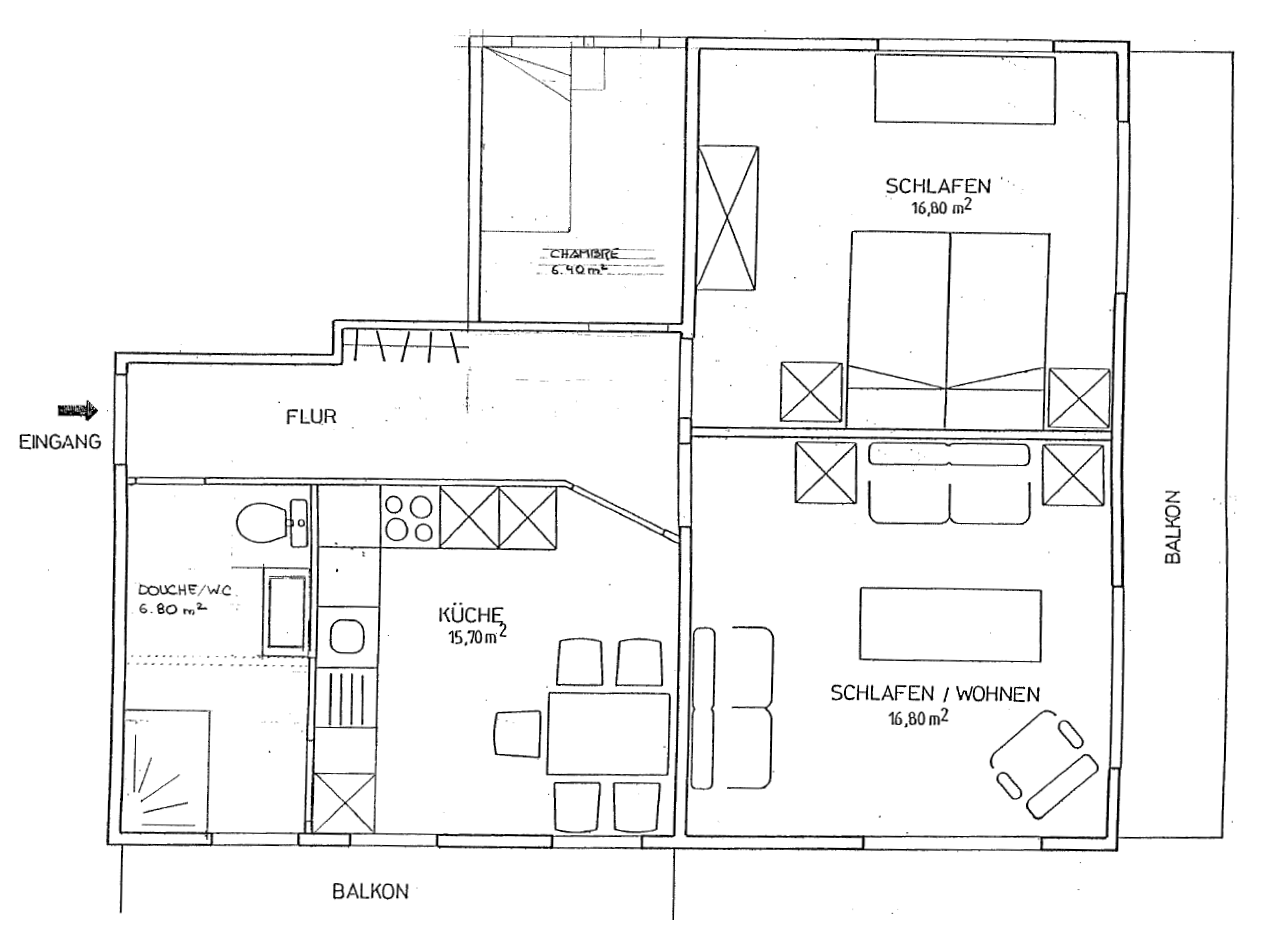 Appartement de 3.5 pièces au 1er étage, deux chambres à deux lits, un séjour avec canapé-lit, grande cuisine avec coin à manger et lave-vaisselle, toilette WC douche, 3 balcons, télévision.