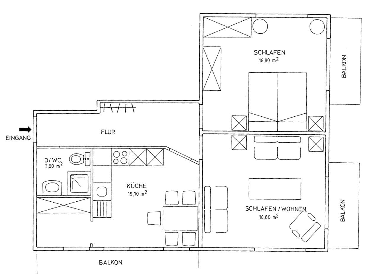 Appartement de 2.5 pièces au 2ème étage, une chambre avec un lit double, un séjour avec canapé-lit, grande cuisine avec coin à manger et lave-vaisselle, toilette WC douche, 3 balcons, télévision, machine à café .