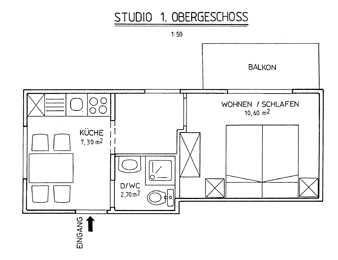 Studio de 1.5 pièces au 2ème étage (23 m2), 2 lits, toilette WC douche, balcon, machine à café.